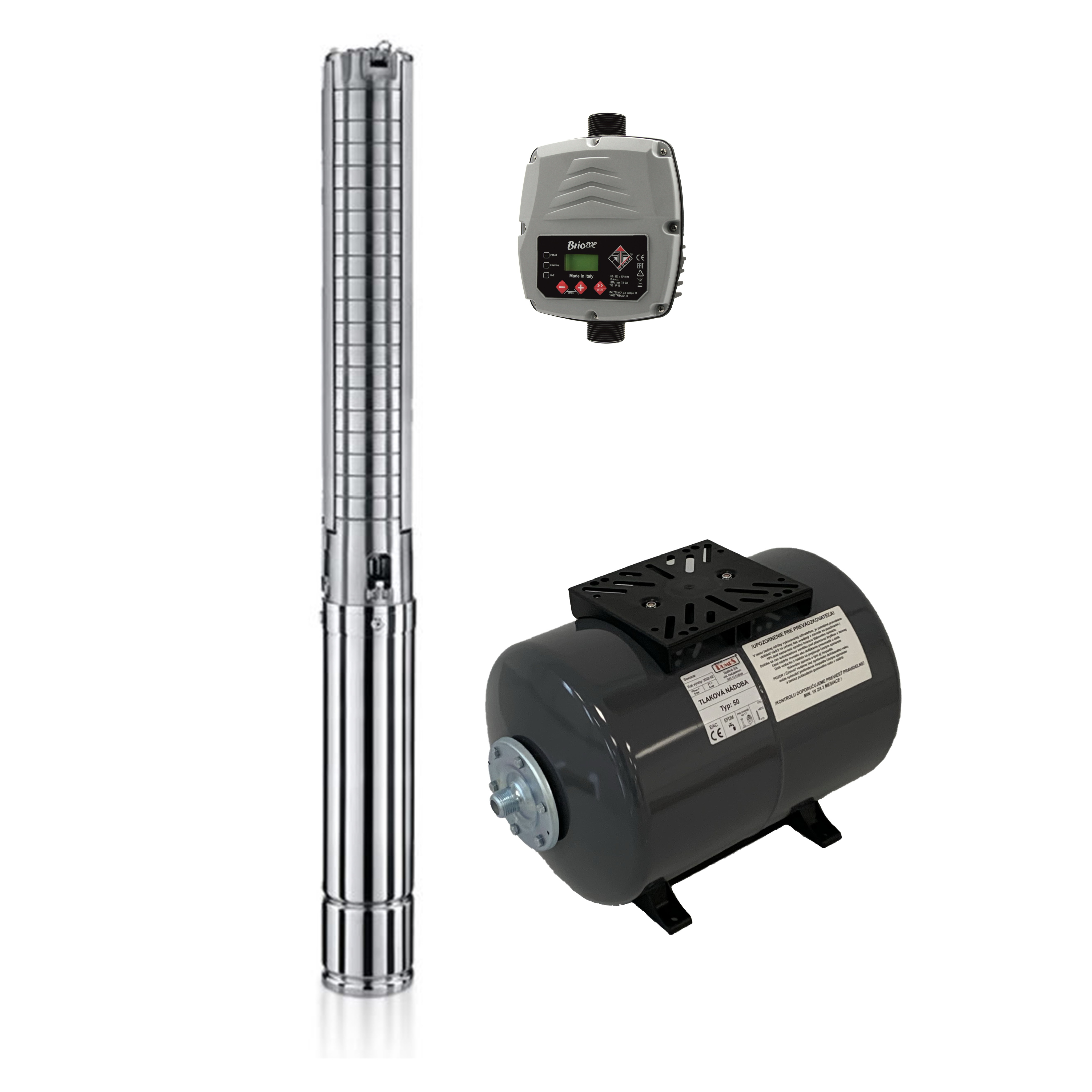 De PumpS 3" BSP 3-32 huishoudelijke dompelwaterpomp met drukvat type 50 en Brio Top - KE regeleenheid is geschikt voor huishoudelijke drinkwater- en huishoudelijke watervoorziening, irrigatie of in industriële toepassingen.