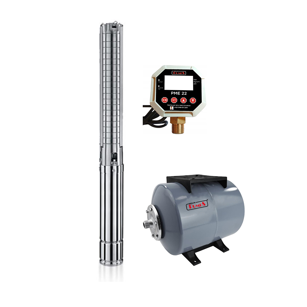 De PumpS 3" BSP 3-32 huishoudelijke dompelwaterpomp met drukvat type 24 en PumpS PME 22 digitale drukschakelaar is geschikt voor huishoudelijke drinkwatervoorziening, irrigatie of in industriële toepassingen.