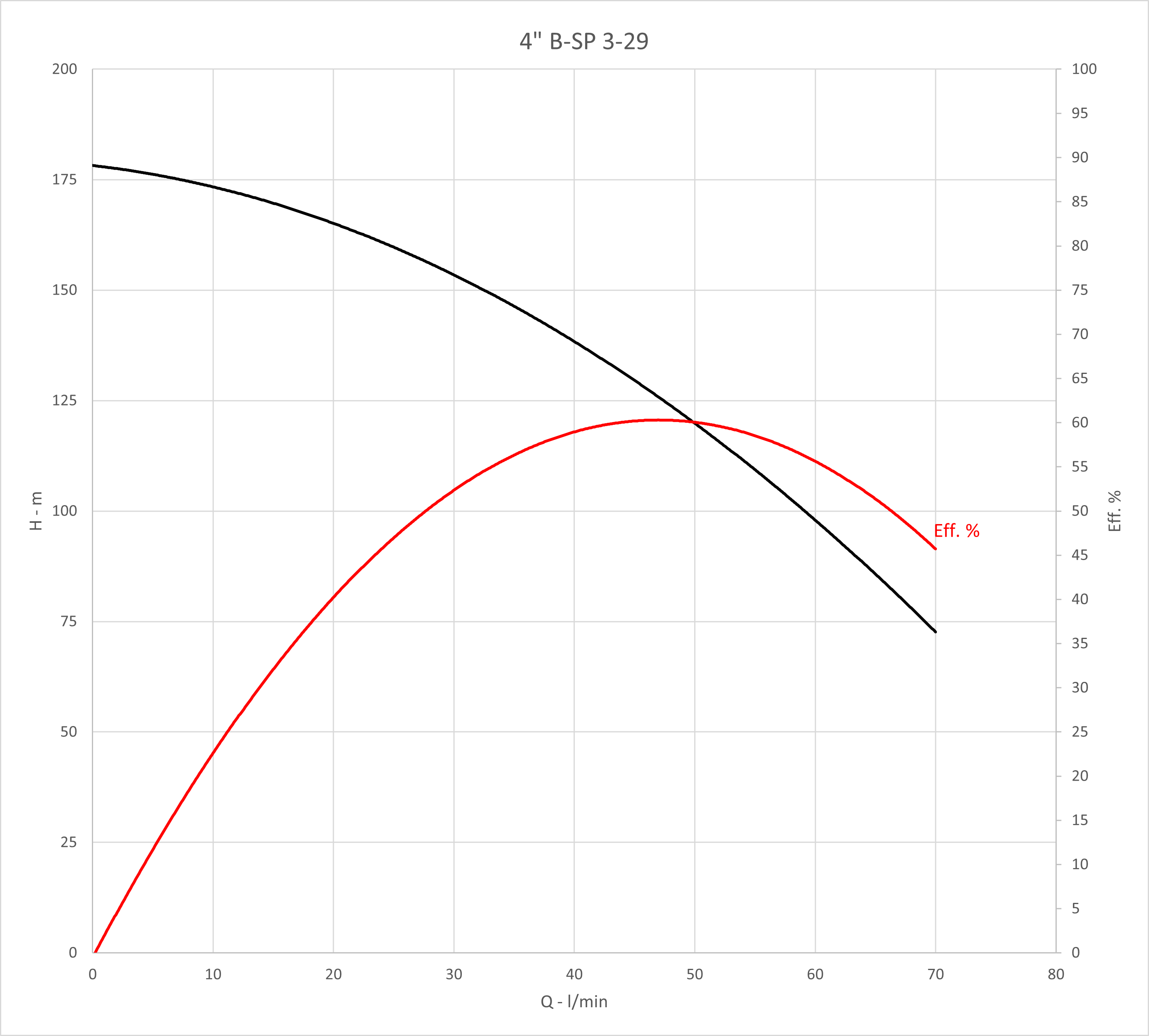Q max: 70 l/min Spanning: 400 V H max: 182 m P max: 2,2 kW DN afvoer - diameter: 5/4 '' Max. temperatuur van verpompte vloeistof: 35 °C Diameter pomp: 98 mm Huidige: 6,4 A Max. diepgang motor: 100 m Type motor: F.B. submersible motors |