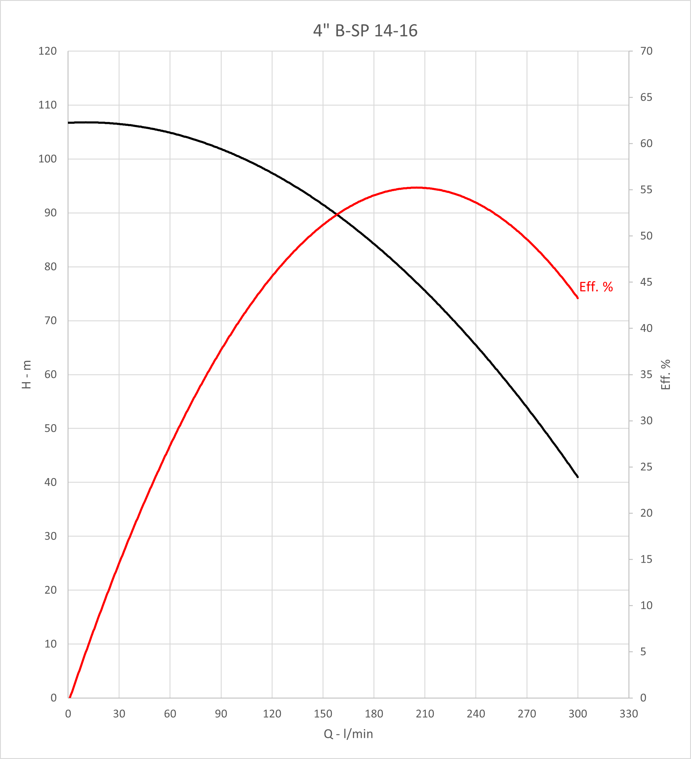 Q max: 300 l/min Spanning: 400 V H max: 124 m P max: 5,5 kW DN afvoer - diameter: 2 '' Max. temperatuur van verpompte vloeistof: 35 °C Diameter pomp: 98 mm Max. diepgang motor: 100 m Max. motorstroom: 12,4 A Type motor: F.B. submersible motors |