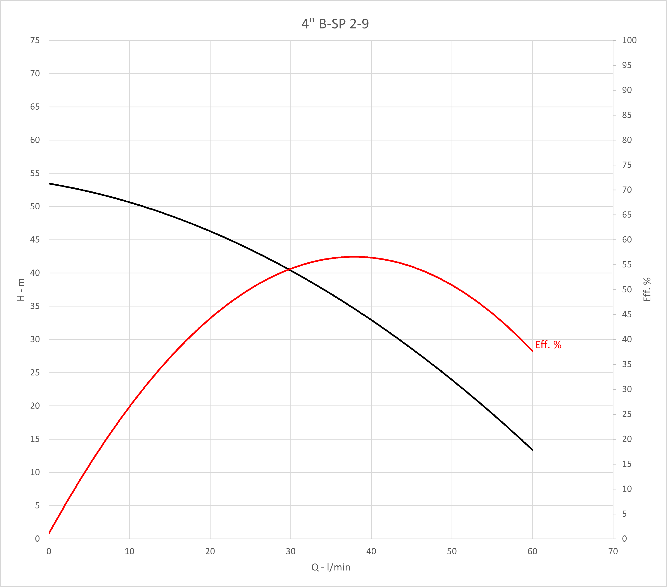 Q max: 60 l/min Spanning: 3x230 V H max: 54 m P max: 0,37 kW DN afvoer - diameter: 5/4 '' Max. temperatuur van verpompte vloeistof: 35 °C Diameter pomp: 98 mm Max. diepgang motor: 100 m Max. motorstroom: 2,2 A Type motor: F.B. submersible motors |