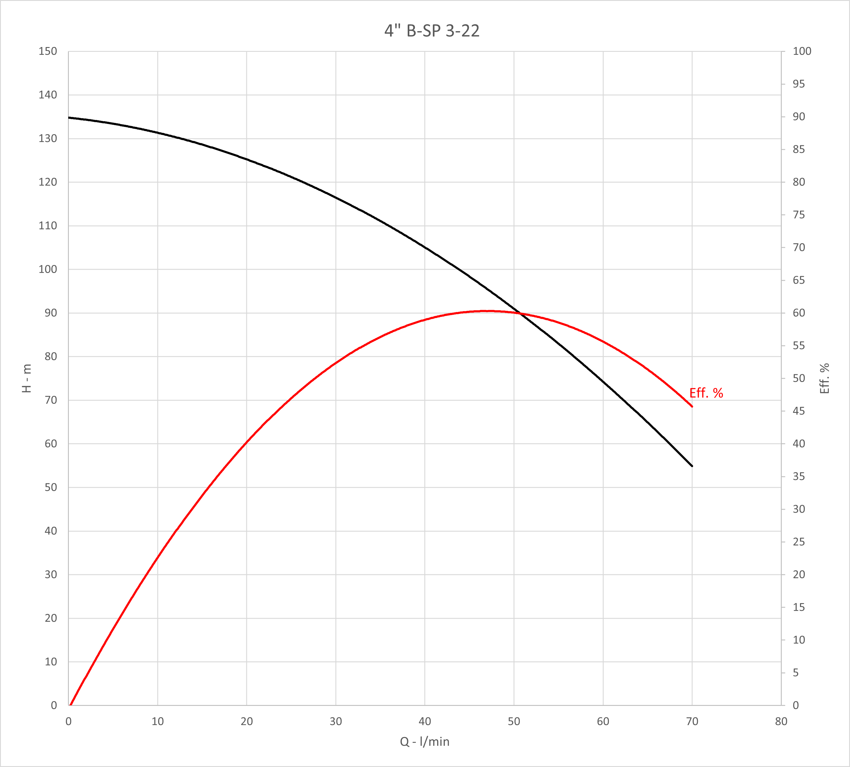 Q max: 70 l/min Spanning: 400 V H max: 138 m P max: 1,5 kW DN afvoer - diameter: 5/4 '' Max. temperatuur van verpompte vloeistof: 35 °C Diameter pomp: 98 mm Huidige: 3,9 A Max. diepgang motor: 100 m Type motor: Franklin Electric |