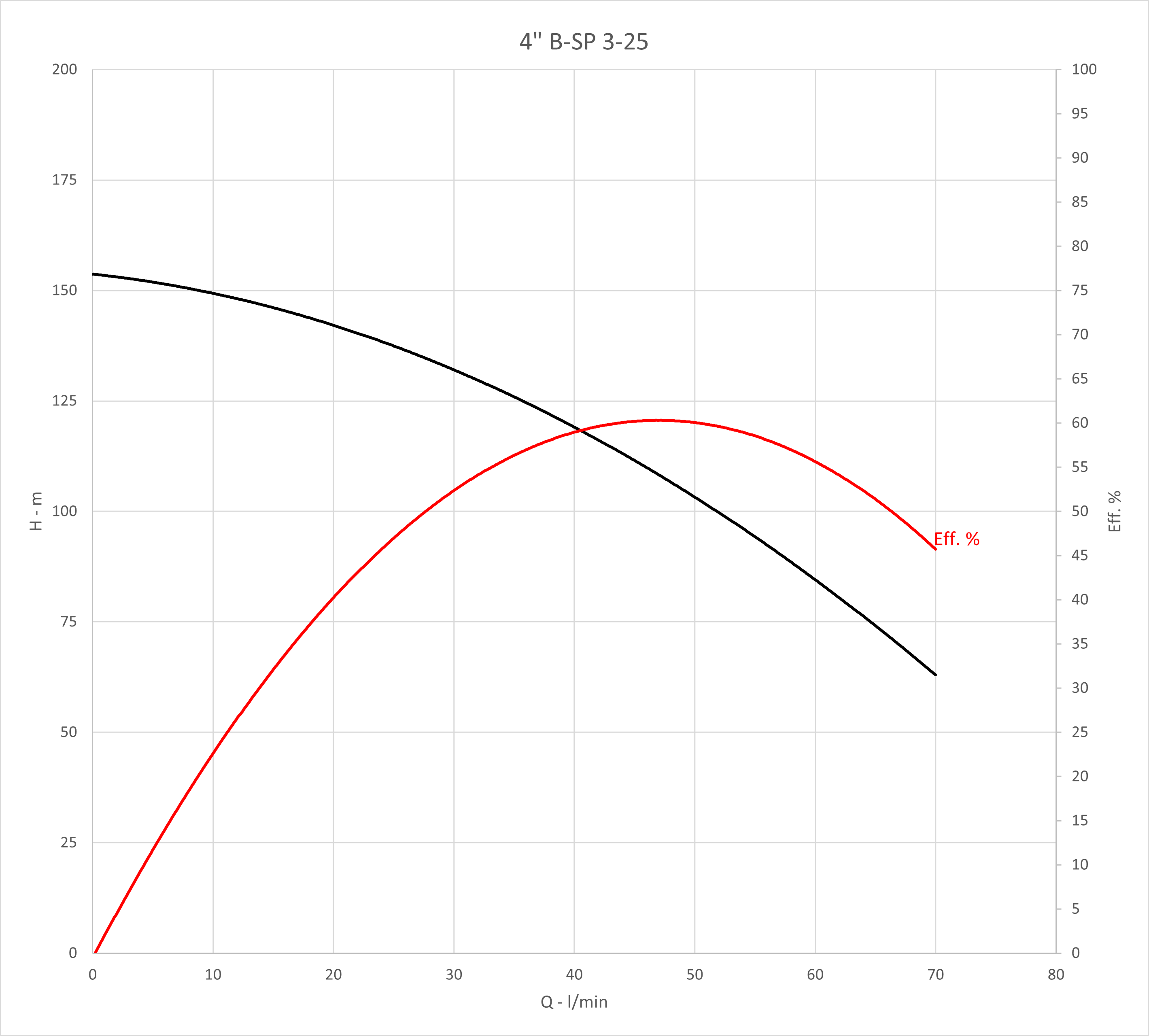 Q max: 70 l/min Spanning: 400 V H max: 326 m P max: 4 kW DN afvoer - diameter: 5/4 '' Max. temperatuur van verpompte vloeistof: 35 °C Diameter pomp: 98 mm Huidige: 9,9 A Max. diepgang motor: 300 m Type motor: F.B. submersible motors |