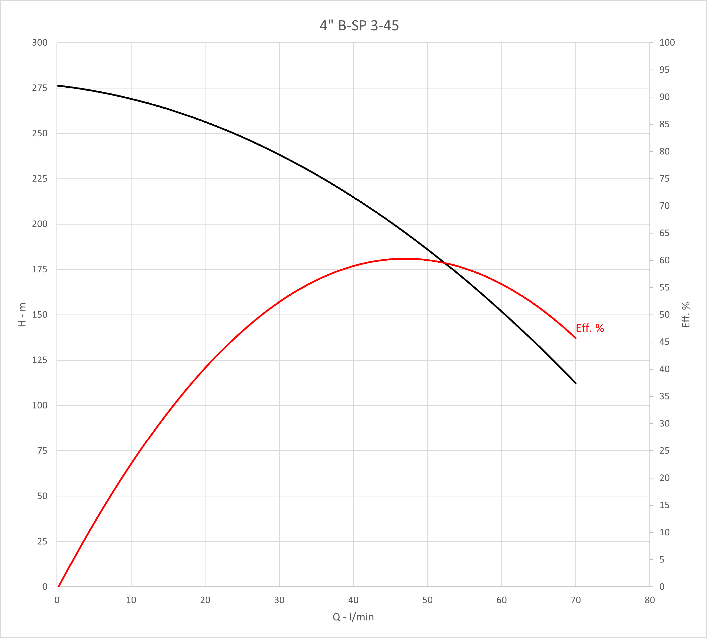 Q max: 70 l/min Spanning: 400 V H max: 326 m P max: 4 kW DN afvoer - diameter: 5/4 '' Max. temperatuur van verpompte vloeistof: 35 °C Diameter pomp: 98 mm Huidige: 9,2 A Max. diepgang motor: 100 m Type motor: F.B. submersible motors |
