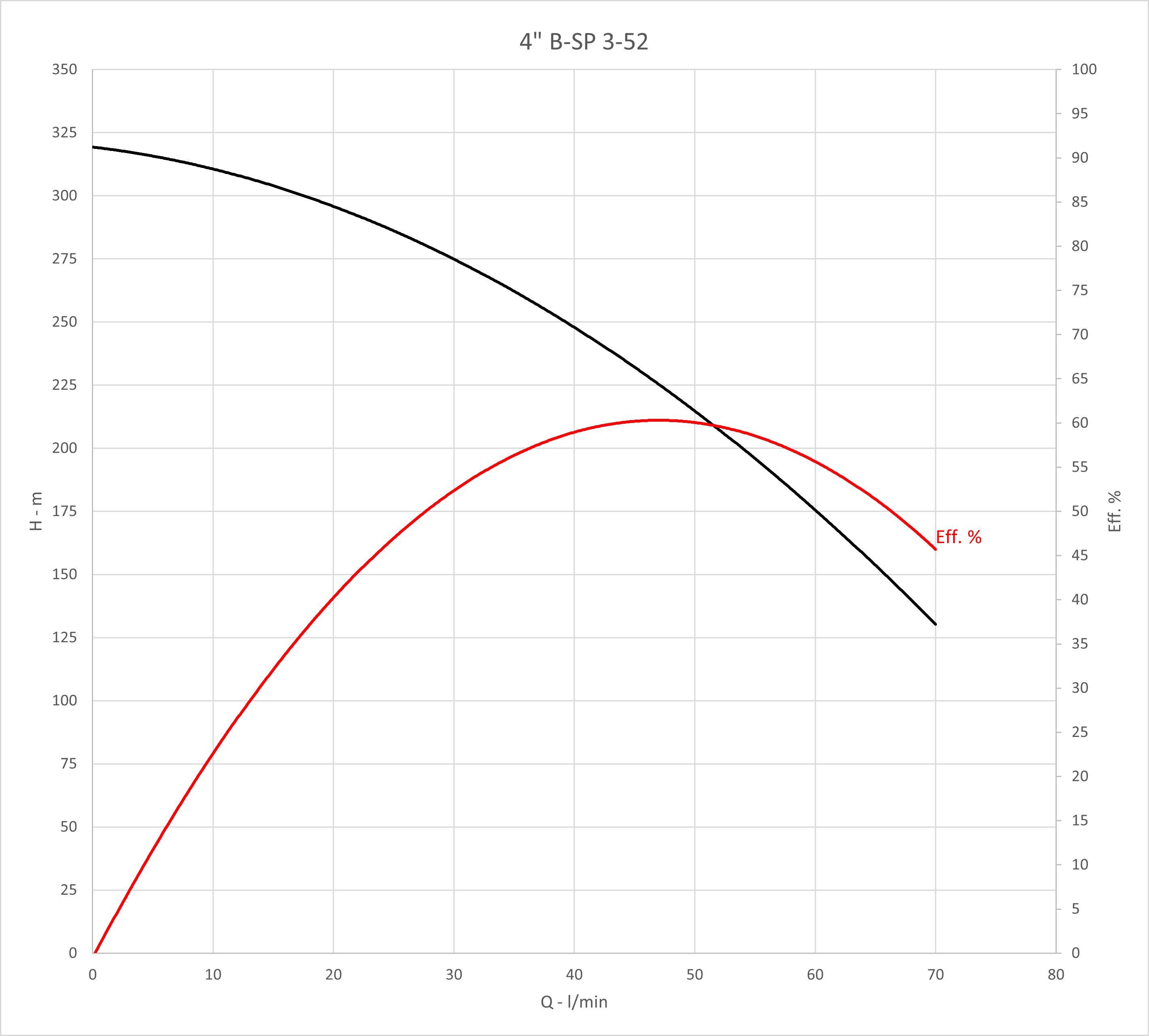 Q max: 70 l/min Spanning: 400 V H max: 326 m P max: 4 kW DN afvoer - diameter: 5/4 '' Max. temperatuur van verpompte vloeistof: 35 °C Diameter pomp: 98 mm Huidige: 9,9 A Max. diepgang motor: 300 m Type motor: F.B. submersible motors |