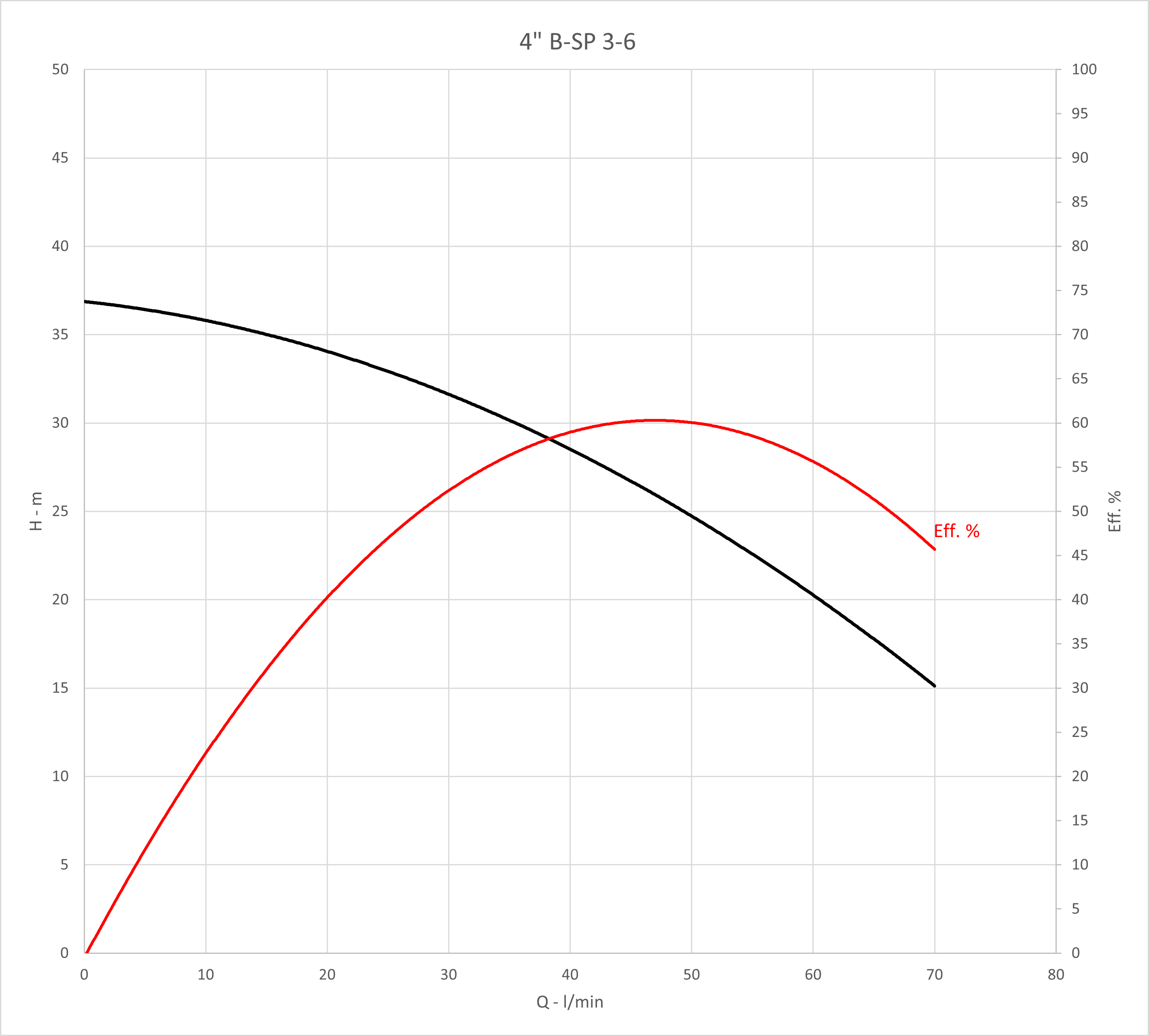 Q max: 70 l/min Spanning: 230 V H max: 38 m P max: 0,37 kW DN afvoer - diameter: 5/4 '' Max. temperatuur van verpompte vloeistof: 35 °C Diameter pomp: 98 mm Huidige: 3,6 A Max. diepgang motor: 100 m Type motor: F.B. submersible motors |