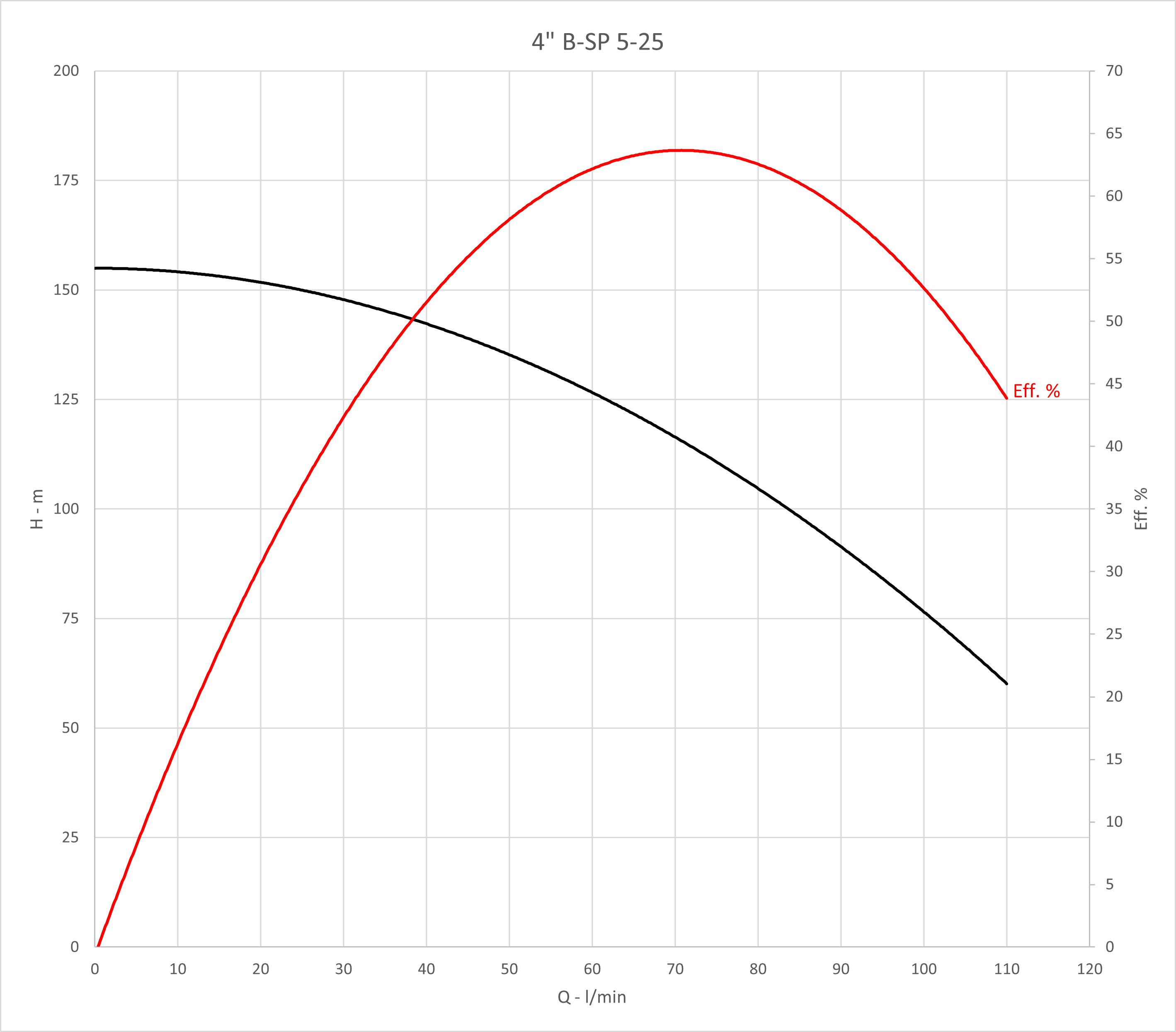 Q max: 110 l/min Spanning: 400 V H max: 159 m P max: 2,2 kW DN afvoer - diameter: 6/4 '' Max. temperatuur van verpompte vloeistof: 53 °C Diameter pomp: 98 mm Max. diepgang motor: 100 m Max. motorstroom: 5,5 A Type motor: Franklin Electric |
