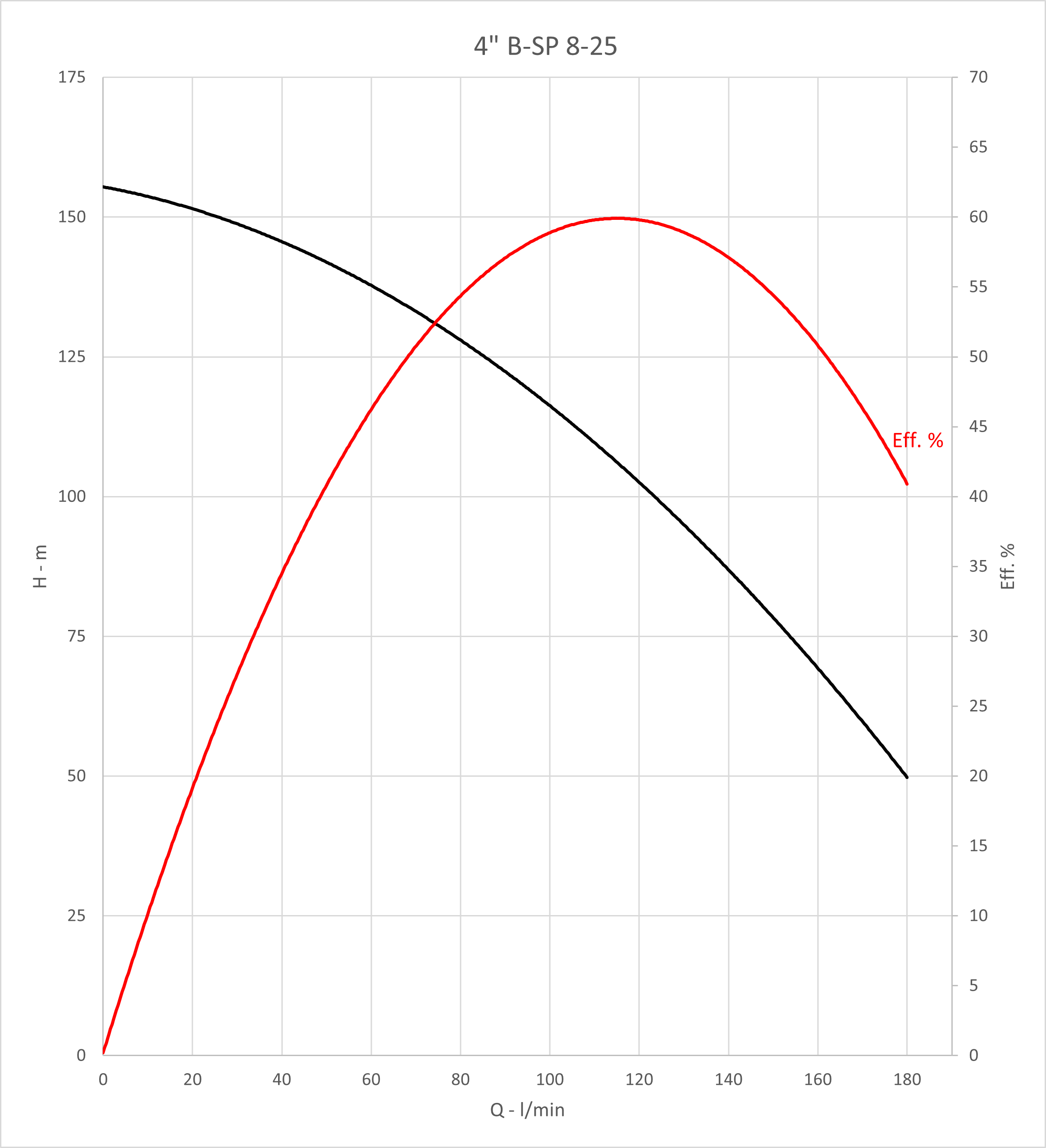 Q max: 180 l/min Spanning: 400 V H max: 191 m P max: 5,5 kW DN afvoer - diameter: 2 '' Max. temperatuur van verpompte vloeistof: 35 °C Diameter pomp: 98 mm Huidige: 12,4 A Max. diepgang motor: 100 m Type motor: F.B. submersible motors |