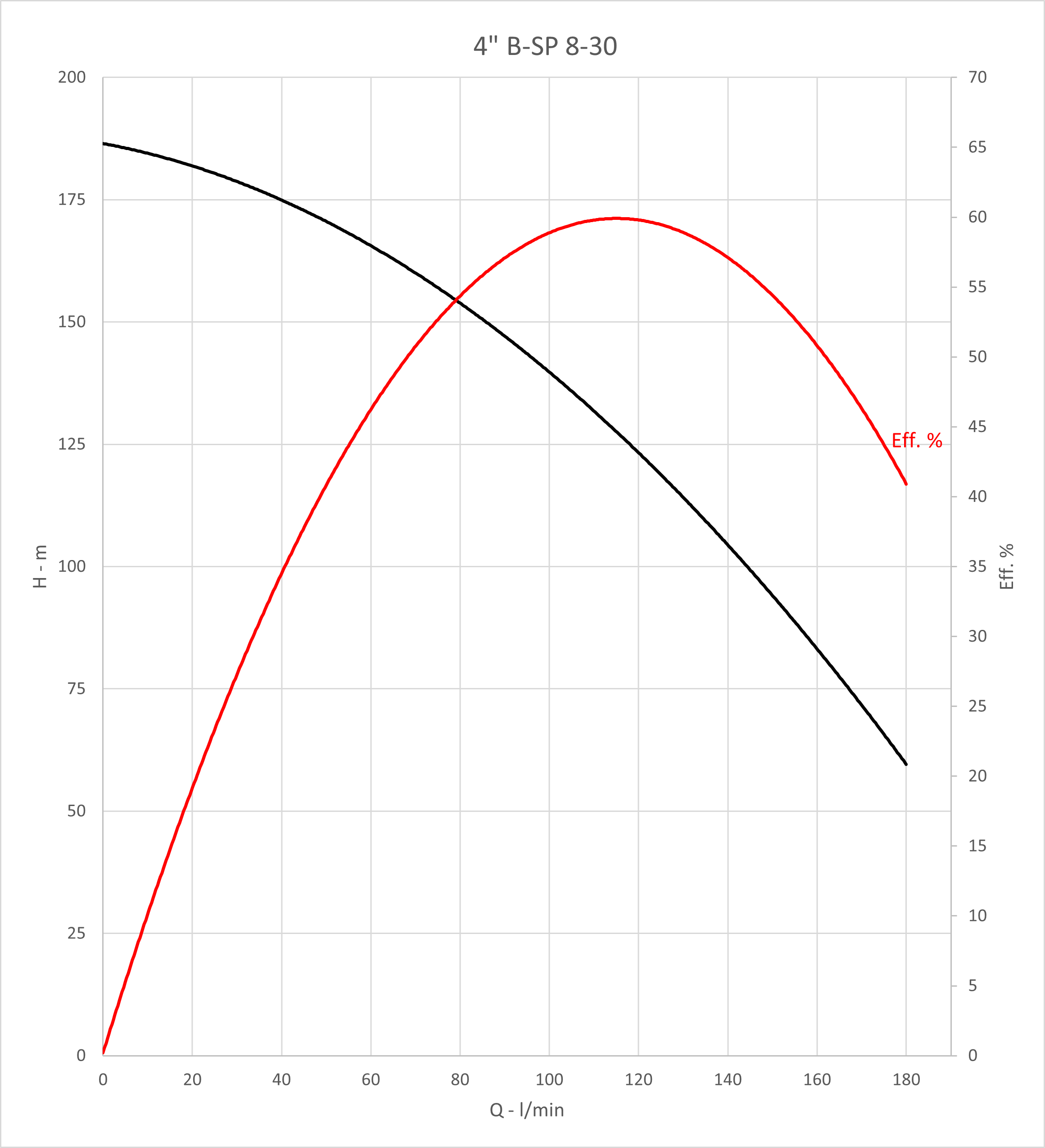 Q max: 180 l/min Spanning: 400 V H max: 191 m P max: 5,5 kW DN afvoer - diameter: 2 '' Max. temperatuur van verpompte vloeistof: 35 °C Diameter pomp: 98 mm Huidige: 12,4 A Max. diepgang motor: 100 m Type motor: F.B. submersible motors |