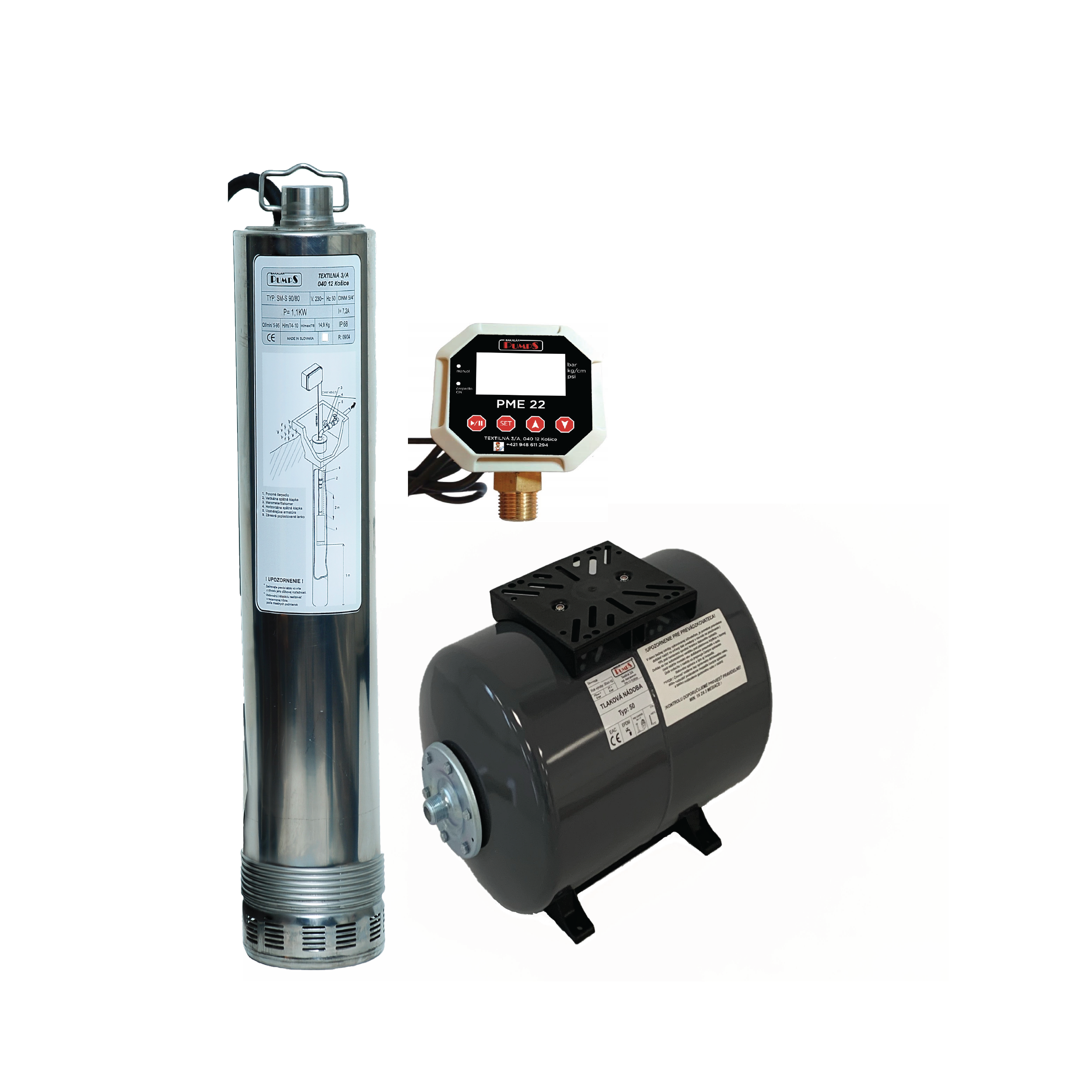De huishoudelijke waterinstallatie met PumpS SMB7 dompelpomp, PumpS PME 22 digitale drukschakelaar en drukvat type 50 is geschikt voor huishoudelijke drinkwatervoorziening, irrigatie of industriële toepassingen.